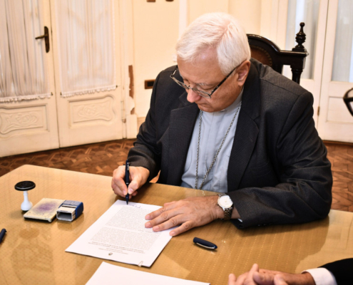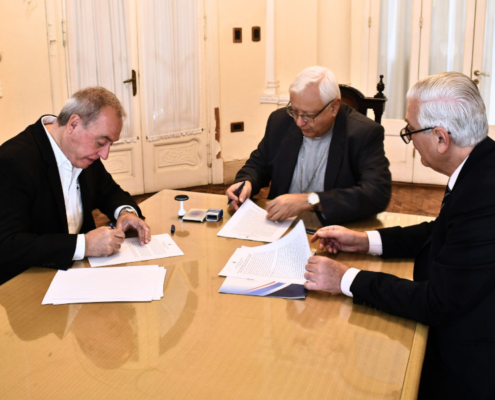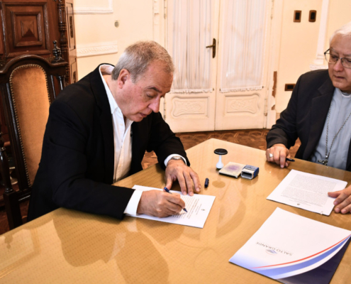 El Obispo, Mons. Gustavo Gabriel Zurbriggen, y el Embajador Alejandro Daneri firmaron un convenio de administración y gerenciamiento a fin de llevar adelante la puesta en valor de este inmueble tan emblemático para la ciudad, cargado de tradición e historia para sus vecinos, que permitirá promover el desarrollo social, turístico y cultural de la comunidad.